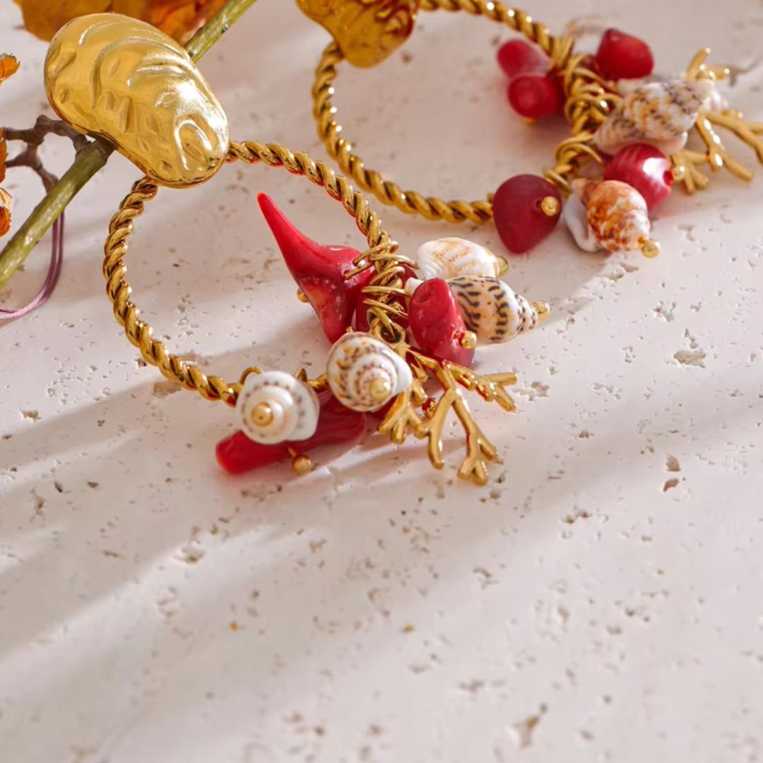 Inspired by the enchanting beauty of the sea, the Oceania Premium Earrings bring the magic of ocean tides and golden shores to life. Featuring delicate dangling seashells, conch, and marine-inspired charms, these exquisitely crafted earrings exude an aura of sophisticated coastal elegance. A perfect statement piece for those who carry the serenity and wonder of the ocean wherever they go.