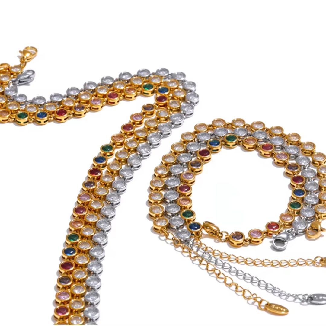 The Tara Gems Premium Bracelet captures the essence of grace and brilliance in a delicate, golden silhouette. Embellished with glimmering zircon stones, each facet reflects light with mesmerizing elegance. Whether worn as a standalone piece or layered for added sophistication, this necklace is a testament to timeless beauty and modern luxury.
